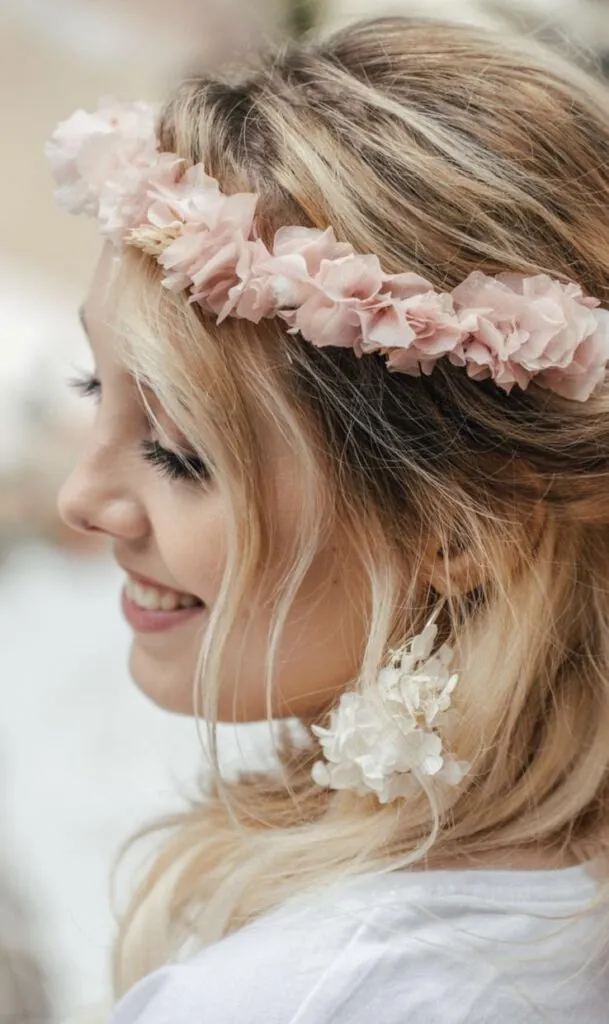 Flower-Crowns für die Haare – wahlweise aus frischen Blumen oder Trockenblumen.
